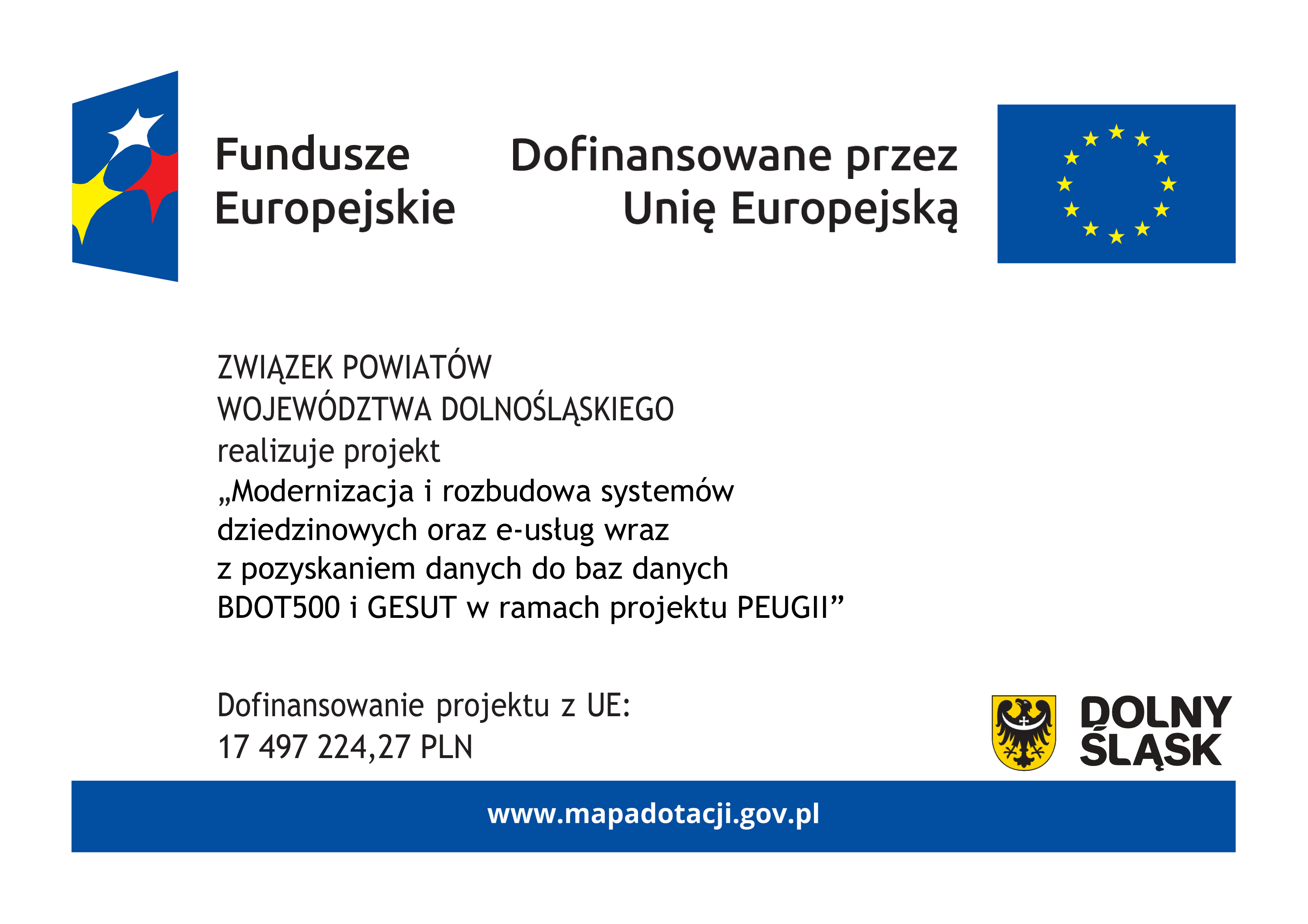 Projekt pn. „Modernizacja i rozbudowa systemów dziedzinowych oraz e-usług wraz z pozyskaniem danych do baz danych BDOT500 i GESUT w ramach projektu PEUG II” realizowany jest przez Związek Powiatów Województwa Dolnośląskiego (Partnera Wiodącego) w partnerstwie z 26 Partnerami Projektu tj.:
