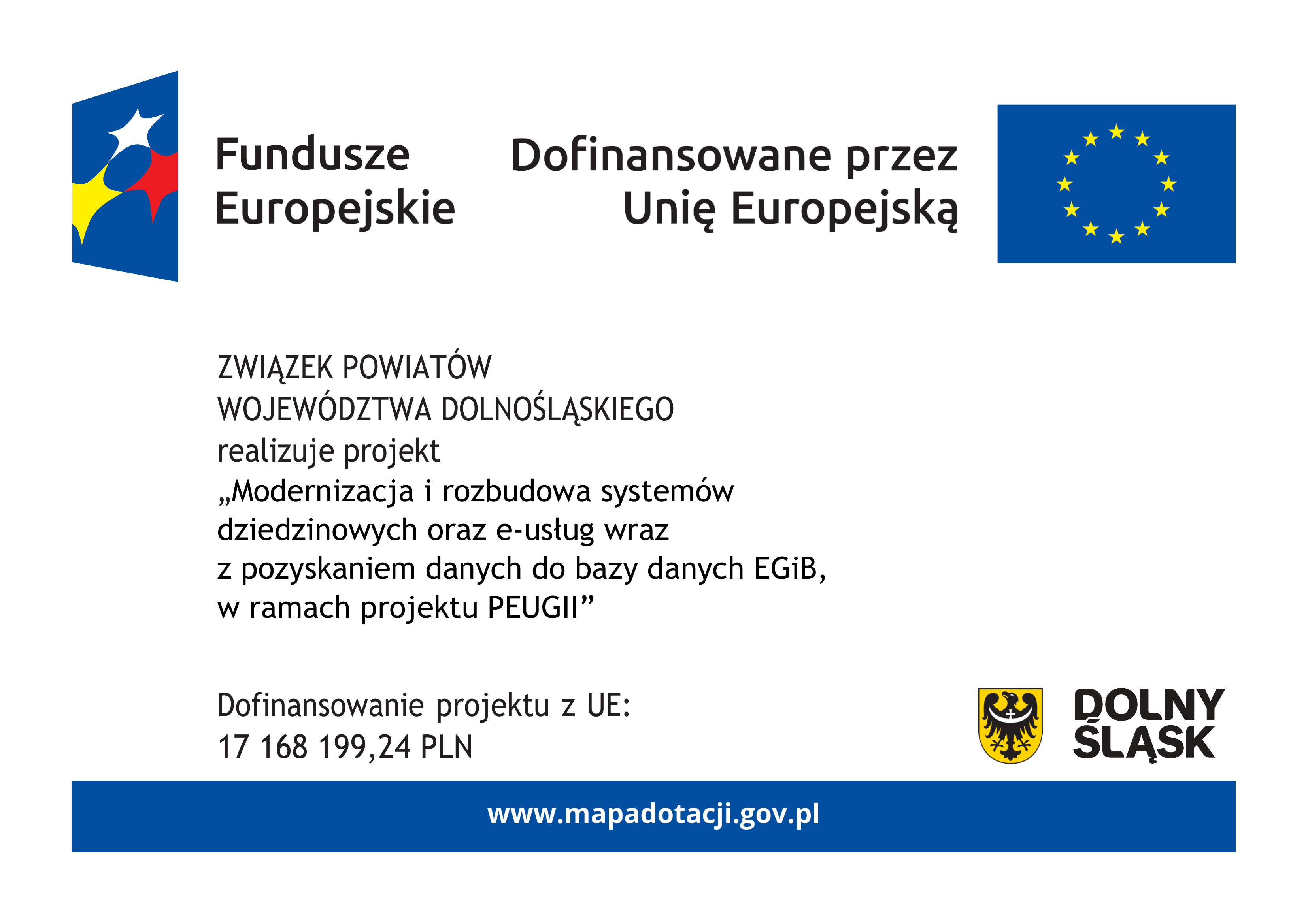 Projekt pn. „Modernizacja i rozbudowa systemów dziedzinowych oraz e-usług wraz z pozyskaniem danych do bazy danych EGiB, w ramach projektu PEUG II” realizowany jest przez Związek Powiatów Województwa Dolnośląskiego (Partnera Wiodącego) w partnerstwie z 26 Partnerami Projektu tj.: