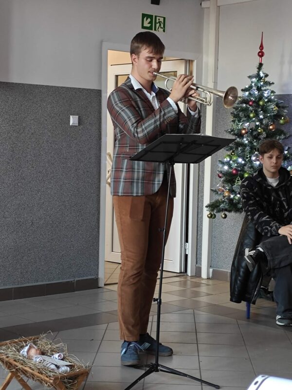 Występujący uczniowie zaśpiewali znane kolędy, Szymon z 5 Technikum Informatycznego zagrał na trąbce, oraz zaprezentowano pantomimę o walce dobra ze złem pt. „Opowieść wigilijna”. Poniżej kilka zdjęć z przedstawienia.